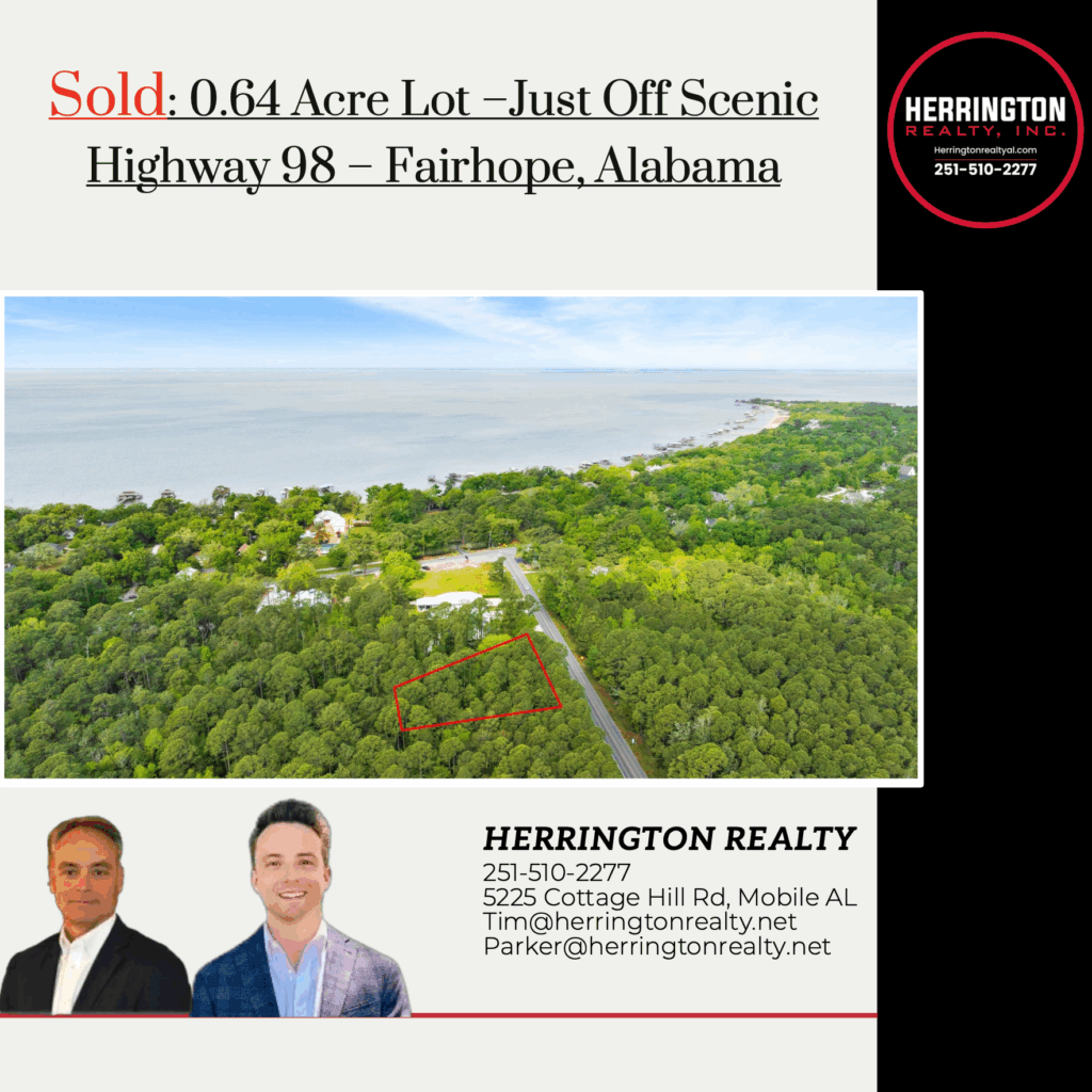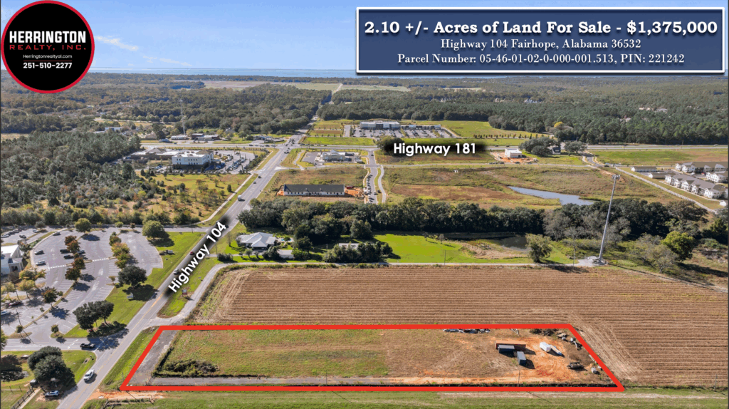 Herrington Realty is pleased to present an exclusive opportunity to purchase 2.10 +/- acres of land in Fairhope, Alabama. The property has 150 feet of commercial frontage on Highway 104 with 610 feet ofdepth. The property is surrounded by new construction projects in the growing Fairhope market such as: Publix Supermarket, Wawa, Sherwin Williams, Waffle House, USA Health Campus, a 230-unit apartment...